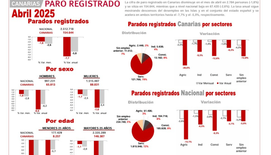 Las variaciones relativas tanto del paro registrado como de los afiliados medios a la Seguridad Social fueron de menor intensidad que a nivel nacional, “una tendencia que suele ser habitual en esta época del año en la que Canarias cierra la temporada alta turística mientras el resto del territorio nacional comienza la Semana Santa y se prepara para el período estival”.