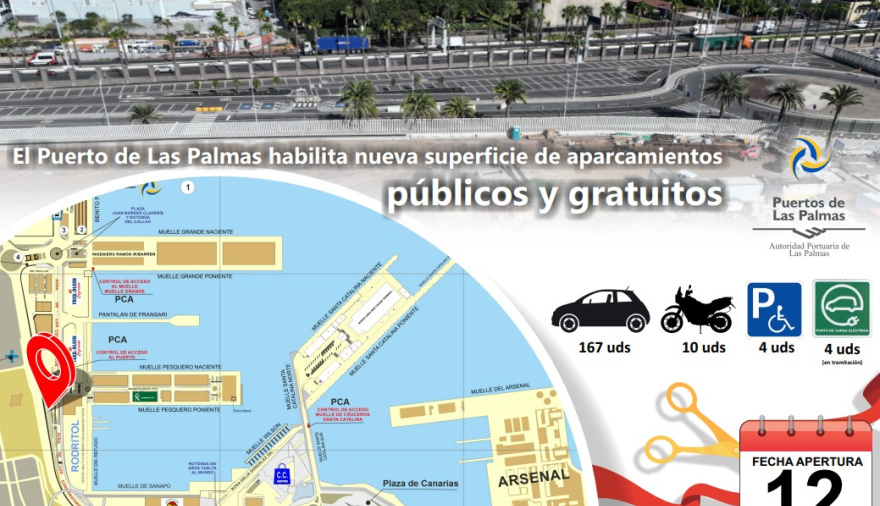A partir de este lunes día 12 de mayo, la Autoridad Portuaria de Las Palmas pone a disposición de la ciudadanía 185 plazas de aparcamiento gratuitas, de las cuales 167 irán destinadas a turismos, cuatro para PMR, 10 plazas para motos y otras cuatro, aún en tramitación, para vehículos eléctricos.