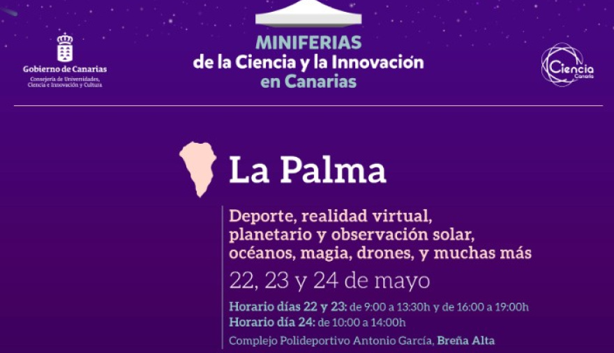 Esta Miniferia tendrá lugar los días 22, 23 y 24 de mayo en el Complejo Polideportivo Antonio García de Breña Alta. Las mañanas están reservadas a los centros educativos de la isla previa inscripción (a partir de 4º de Primaria, Secundaria, Bachillerato y Formación Profesional) y las tardes y el sábado están abiertas al público general.