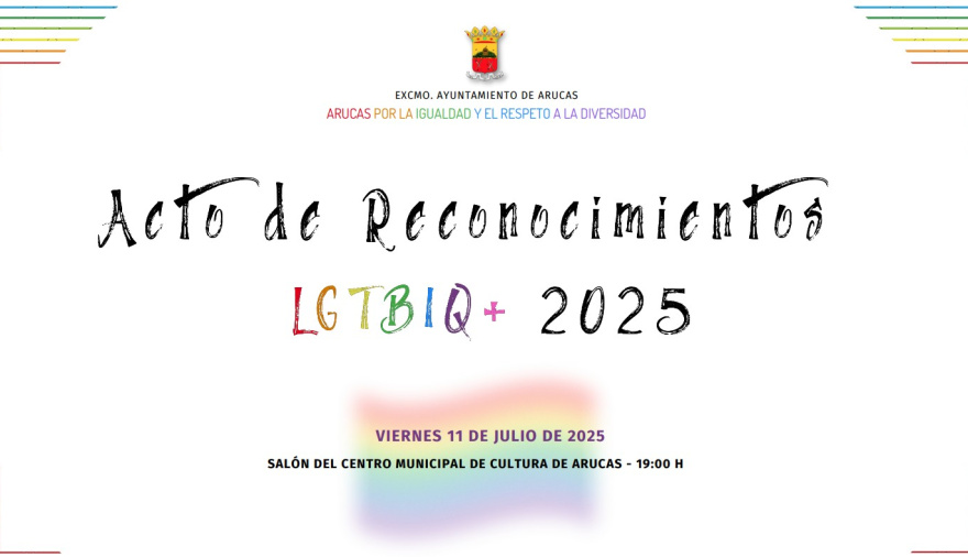 El Ayuntamiento de Arucas, a través de la Concejalía de Políticas de Igualdad, llevará a cabo un acto de reconocimientos a distintas personas, familias y/o entidades por su esfuerzo en impulsar, divulgar y luchar en favor del colectivo LGTBIQ+ en Arucas, este viernes 11 de julio a las 19:00 horas en el Centro Municipal de Cultura.
