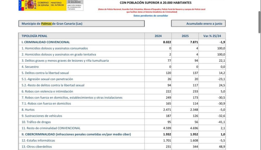 Según las estadísticas oficiales correspondientes al primer semestre de 2025, los homicidios dolosos y asesinatos consumados han pasado de 0 a 4 respecto al mismo periodo de 2024, lo que supone que se multiplican por cuatro.