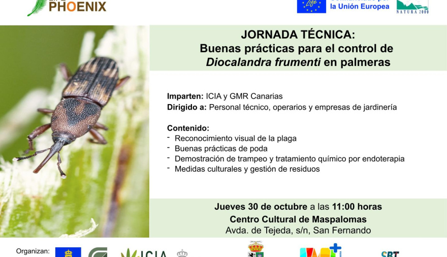 La sesión lleva por título ‘Buenas prácticas para el control de Diocalandra frumenti en palmeras’y su objetivo principal es ofrecer una amplia revisión sobre los aspectos más importantes de esta plaga desde el punto de vista técnico, explicar las medidas recomendadas en función de la biología del insecto, así como fomentar un espacio de intercambio y debate técnico sobre esta problemática. La formación consistirá en una primera explicación teórica, seguida de una demostración práctica sobre las técnicas recomendadas.