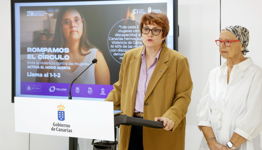 La consejera de Bienestar Social, Igualdad, Juventud, Infancia y Familias, Candelaria Delgado, y la directora del Instituto Canario de Igualdad (ICI), Ana Brito, destacaron esta mañana la necesidad de visibilizar las violencias machistas que sufren las mujeres con discapacidad durante la presentación de la campaña institucional del Gobierno de Canarias con motivo del 25 de noviembre, Día para la Eliminación de la Violencia contra las Mujeres.