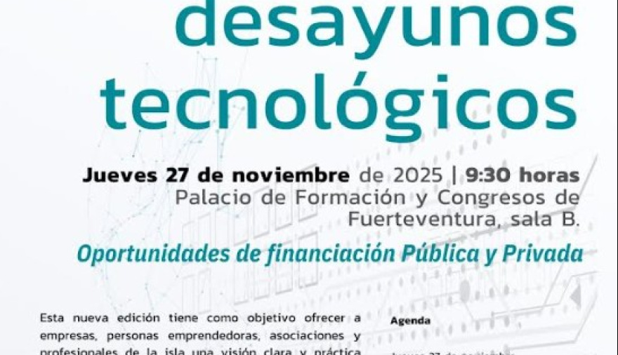 El Cabildo de Fuerteventura, a través de su Área de Nuevas Tecnologías, celebra una nueva edición de los Desayunos Tecnológicos el próximo jueves 27 de noviembre bajo el lema “Oportunidades de Financiación para mi Empresa”.