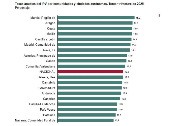 La variación anual del Índice de Precios de Vivienda (IPV) en el tercer trimestre de 2025 aumentó 0,1 puntos, y se situó en el 12,8% tal y como publica el INE.