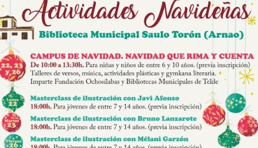 La Biblioteca Municipal Saulo Torón (Arnao) acogerá durante los últimos días de diciembre una variada programación cultural y educativa con motivo de la Navidad, dirigida a niñas, niños, jóvenes y familias, que combina literatura, música, ilustración y actividades lúdicas. Entre las propuestas más destacadas se encuentra el Campus de Navidad “Navidad que rima y cuenta”, que se celebrará los días 22, 23 y 26 de diciembre, en horario de 10:00 a 13:30 horas, y que está dirigido a niñas y niños de entre 6 y 10 años, previa inscripción.