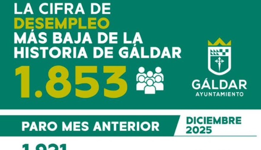 Gáldar cerró el año 2025 con una clara mejora en sus indicadores laborales. Según los datos publicados por el Observatorio Canario de Empleo (OBECAN), organismo del Gobierno de Canarias, en diciembre de 2025 el número de personas inscritas como desempleadas se situó en 1.853, cifra inferior respecto a noviembre y al mismo período de 2024, siendo la más baja de la historia del municipio.
