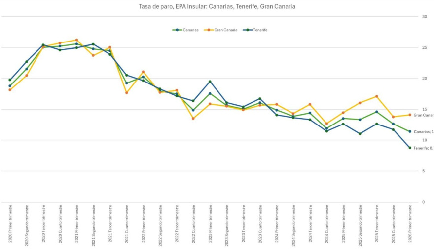 Tenerife registra una tasa de desempleo que se sitúa en un 8,7%, la cifra más baja de los últimos 19 años, según los datos aportados este pasado martes por el Instituto Canario de Estadística (ISTAC), a partir de los datos extraídos de la Encuesta de Población Activa (EPA), correspondiente al primer trimestre de 2026. Informe que también revela que la isla ha logrado el mejor arranque de año de toda la serie histórica.