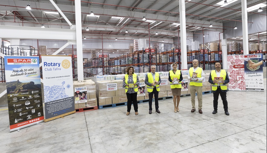 El presidente de Rotary Club Tafira, Gerson Echavarría, y el socio de Rotary, Manuel Pineda, recibieron hoy junto a la secretaria general de Cáritas Diocesana de Canarias, Caya Suárez, la mercancía solidaria reunida por SPAR Gran Canaria, acompañados por los representantes de la cadena canaria, su vicepresidente, José López, y la directora general, Dunia Pérez.