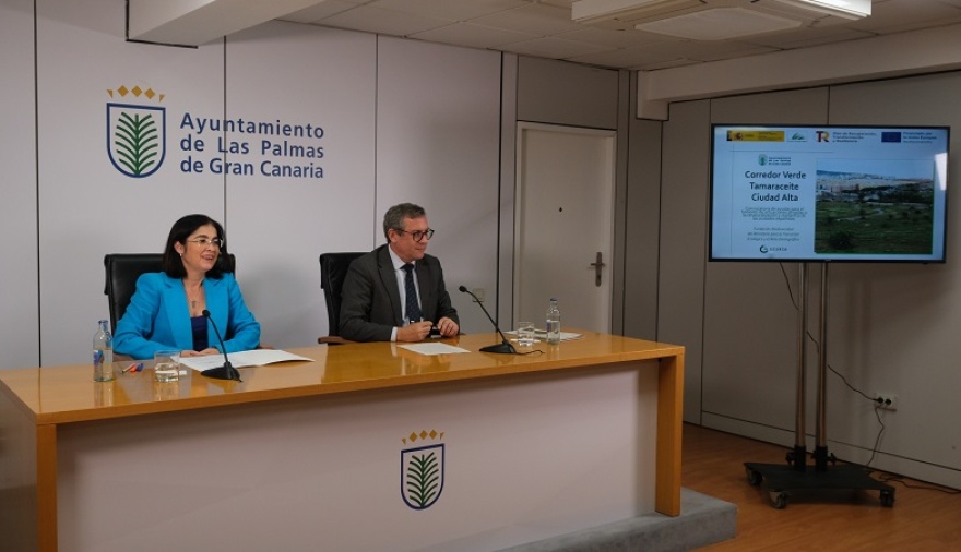 La alcaldesa de Las Palmas de Gran Canaria, Carolina Darias, junto al concejal de Planificación, Desarrollo Urbano y Vivienda, Mauricio Roque, presentaron el proyecto del Corredor Verde entre Tamaraceite y Ciudad Alta que renaturalizará un espacio de 459.016 metros cuadrados con la plantación de 10.300 nuevos ejemplares de árboles, palmeras, arbustos y matorral que mejorarán las condiciones de biodiversidad en el espacio urbano.