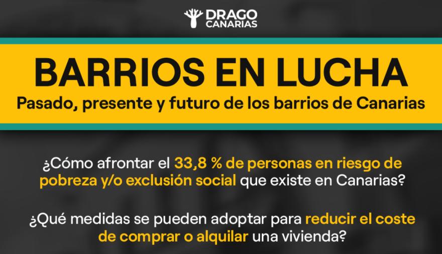 Las condiciones de vida de los canarios y canarias y el problema de acceso a la vivienda serán las temáticas principales de “Barrios en lucha. Pasado, presente y futuro de los barrios de Canarias”, el acto organizado por Drago Canarias este viernes, 14 de junio, en Santa Cruz de Tenerife.