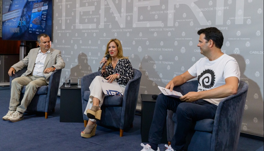 La presidenta del Cabildo, Rosa Dávila; el director insular de Medio Natural, Pedro Millán; y el director del Ciclo Internacional de Cine Submarino de Donostia-San Sebastián, David Sánchez Carretero. Dávila ha reafirmado “el compromiso del Cabildo por la sostenibilidad. Es la primera vez que el Cimasub se va a celebrar fuera de San Sebastián y tenemos la oportunidad de que sea en Tenerife. Somos humildes, pero nuestra aspiración es ir creciendo poco a poco porque se trata de una herramienta para dar a conocer el estado de los fondos marinos y concienciar a la población de Tenerife”.