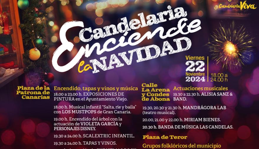 El espíritu navideño llega a Candelaria este viernes 22 de noviembre con un día repleto de actividades para todos los públicos. La Plaza de la Patrona de Canarias se vestirá de gala para acoger el tradicional encendido del árbol, que marcará el inicio de una programación llena de magia e ilusión.