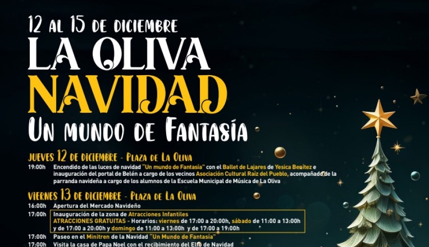 El Ayuntamiento de La Oliva presenta, a través de la Concejalía de Cultura, que dirige David Hernández, ‘Navidad, un mundo de fantasía’. La Plaza de La Oliva se llenará de luces centelleantes del 12 al 15 de diciembre para traer el espíritu navideño al municipio en un evento para todas las edades. Encendido de luces, inauguración del portal de Belén, atracciones infantiles gratuitas, paseo en minitren, visita de Papa Noel, XXVI Encuentro de Villancicos, paintball, diferentes talleres y mercadillo navideño, serán algunas de las actividades de las que se podrán disfrutar durante el fin de semana que servirá como apertura de la temporada navideña en el municipio.