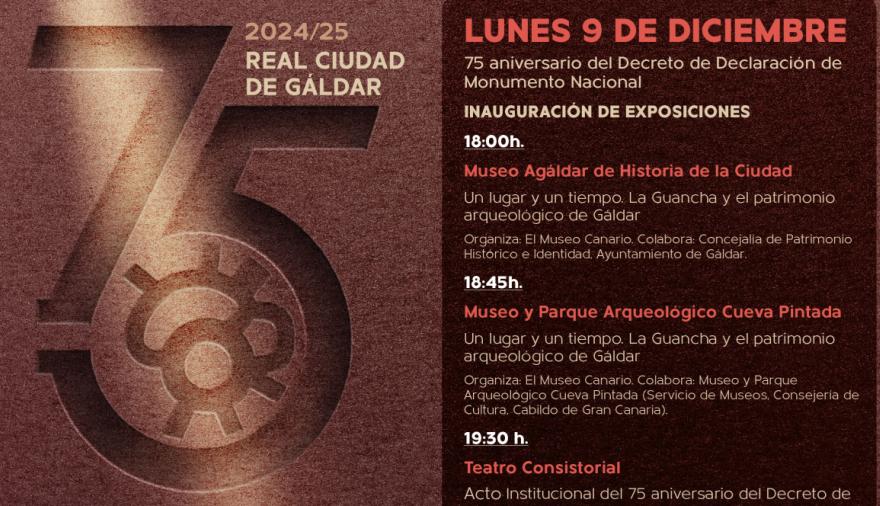 La ciudad de Gáldar continúa conmemorando el 75 aniversario del yacimiento arqueológico La Guancha como Bien de Interés Cultural (entonces Monumento Nacional) con un acto institucional que se realizará este lunes, 9 de diciembre, en el Teatro Consistorial a las 19.30 horas. El evento forma parte de una amplia programación especial desplegada desde noviembre pasado y que también incluye la inauguración de dos exposiciones en las que este significativo enclave es el gran protagonista.