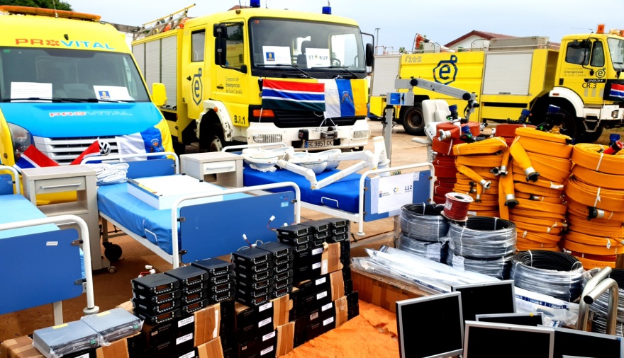 La entrega de este primer lote ha sido de dos camiones de bomberos, una ambulancia, tres vehículos ligeros, material sanitario y un equipo completo de radiocomunicación de emergencias. El acto se celebró en el exterior de la State House, sede de la residencia oficial del presidente en un acto sin precedentes que también contó con el ministro de Interior, Defensa e Información, el embajador de Gambia en España, y los responsables de los servicios de bomberos y de la Autoridad Reguladora de Servicios Públicos (PURA).