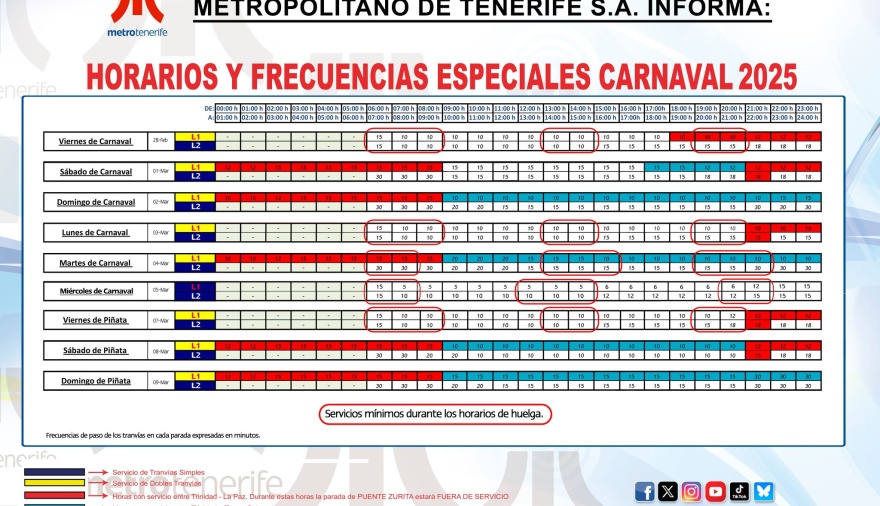 Los servicios pueden consultarse en todas las paradas del tranvía y las redes sociales de Metrotenerife, en Facebook, Instagram y X (@tranviatenerife).