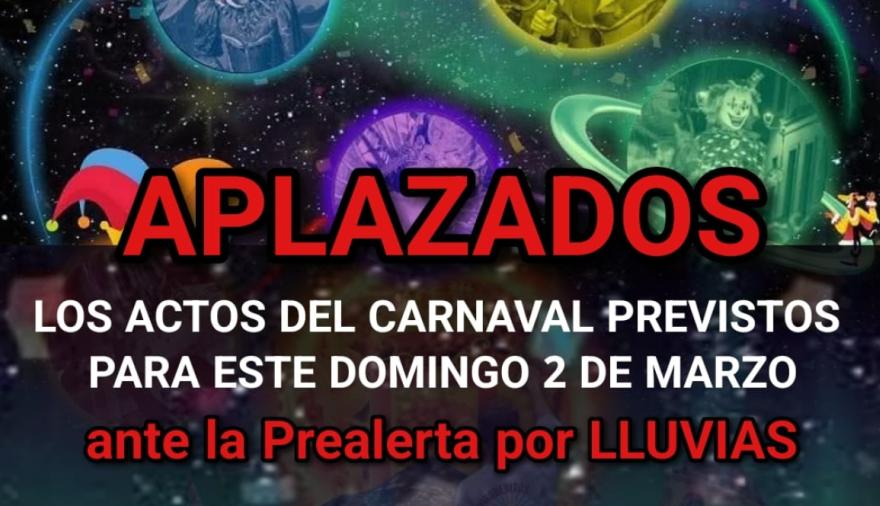 Ante la previsión de la AEMET de 100% de lluvias para mañana domingo, 2 de marzo, el Ayuntamiento de La Orotava ha decidido por seguridad y garantizar la fiesta para todos, el trasladar los actos de las carnestolendas previstos para esta jornada. Así, el Carnaval en la Calle y Carnaval Infantil que se preveían celebrar desde por la mañana hasta por la tarde, se trasladan para el próximo sábado 8 de marzo en el mismo horario, y la gala infantil de elección de Reina y Rey del Carnaval 2025, previsto para este domingo por la tarde-noche, se aplaza para el próximo jueves 6 de marzo a las 19.00 horas.