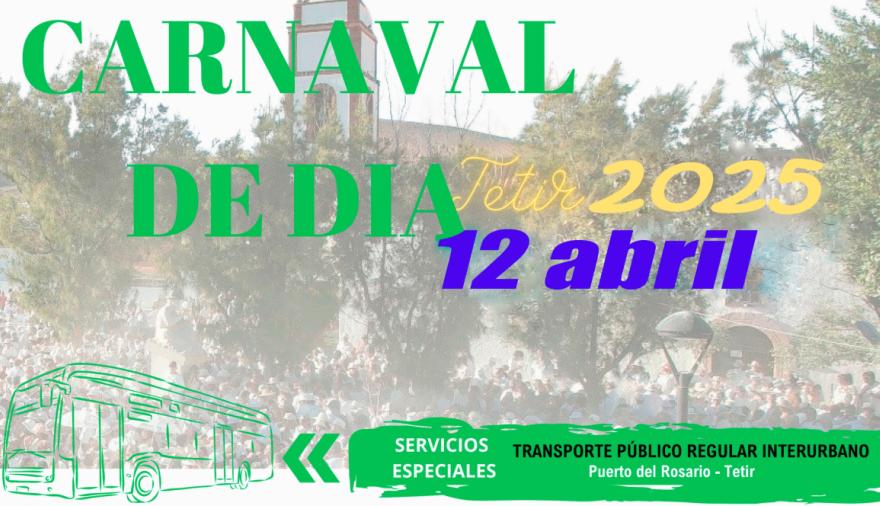 El Cabildo de Fuerteventura, a través de la Consejería de Transportes y la empresa que presta el servicio de transporte regular interurbano de viajeros Tiadhe, establece servicios especiales de guaguas con motivo del Carnaval de Día de Tetir que se celebra este sábado, 12 de abril, para garantizar la seguridad en el traslado y evacuación de asistentes, además de promoción del transporte público seguro.