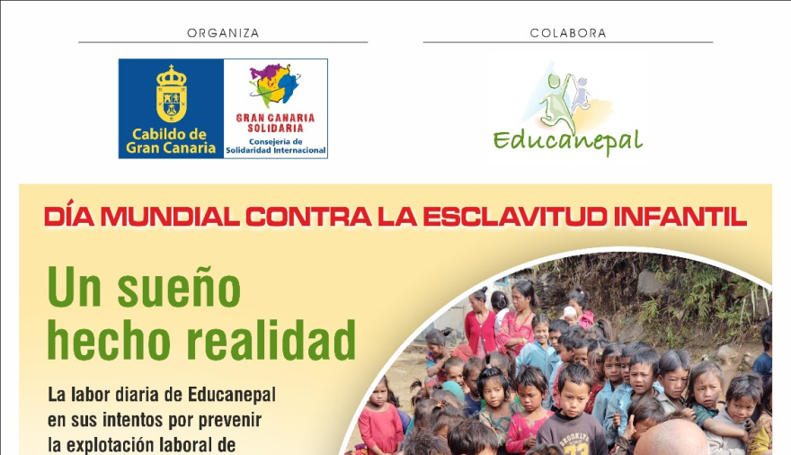 La Consejería de Solidaridad Internacional que dirige Carmelo Ramírez, siguiendo con su calendario de actividades de sensibilización y concienciación, ha organizado con motivo del Día Mundial Contra la Esclavitud Infantil la celebración de la charla coloquio ‘Un sueño hecho realidad’ a cargo de José Díaz, fundador de la ONG EducaNepal, en la cual disertará sobre la labor que lleva a cabo la organización en sus intentos por prevenir la explotación laboral de los menores en Nepal. El acto tendrá lugar el próximo jueves 24 de abril a las 19.30 horas, en el Patio del Cabildo.